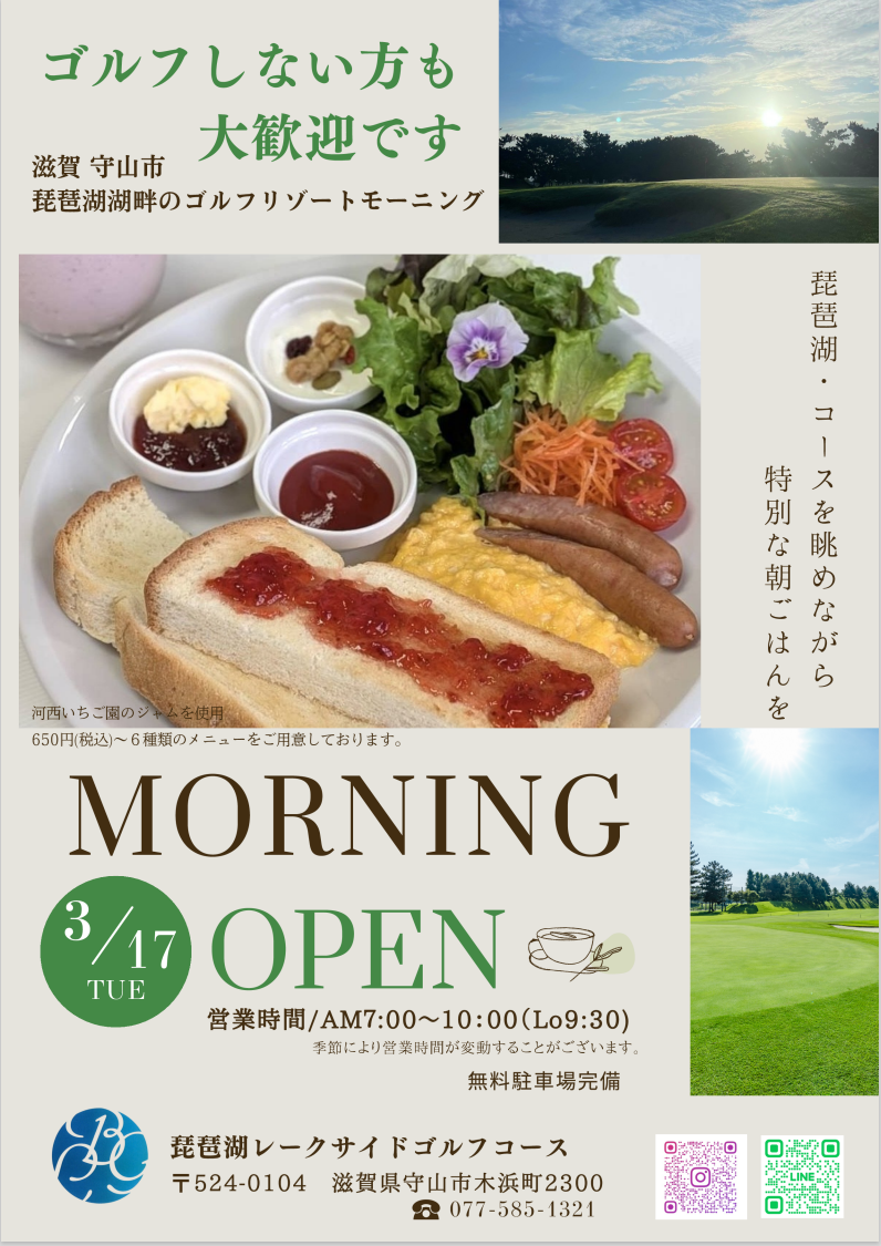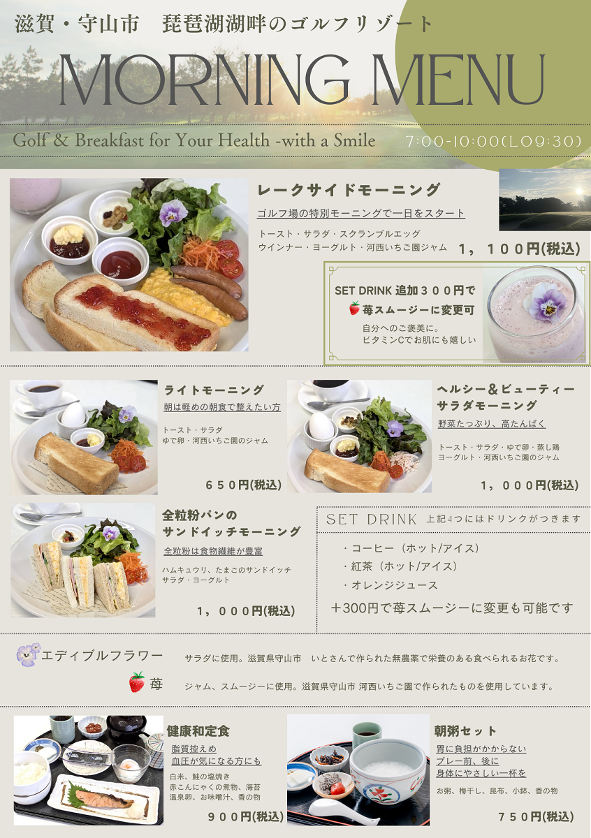 コース ハーフプレー 料金 レストラン 競技会 通常予約 1人予約 MENUCLOSE トップページ お知らせ 競技会 コース 施設案内 レストラン 料金 ご利用案内 ハーフプレー ゴルフ初心者の方へ アクセス お問い合わせ・申込書 通常予約 通常予約 1人予約 お知らせNEWS トップ お知らせ レストランモーニングメニュー 一部リニューアル ご案内 レストランモーニングメニュー 一部リニューアル 2026.03.17 3月17日(火)より、レストランモーニングメニューを一部リニューアルいたしました。 栄養バランスを考えた朝食を6種類ご用意いたしました。 お客様のシーンにあったメニューをお選びいただけます。 また、ゴルフプレーされない日でもご利用いただけます。 ぜひ、この機会にモーニングをお召し上がりください。 ダウンロード ダウンロード 一覧へ戻る ご予約はこちら 通常予約 1人予約