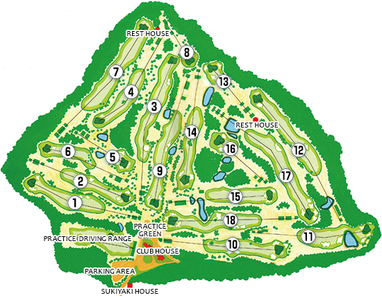 フラットな丘陵コースだが、フェアウエイ、グリーンともにアンジュレーションがあり見た目以上に難しい。4番ミドルホールは第1打で右サイドの山桃の木の左を狙うとよい。